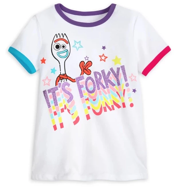It’s Forky! The misfit spork fromΒ Toy Story 4Β is eager to play on this fun fashion ringer tee with glittering graphics and colorful trims.